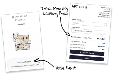 Planning your budget is essential, and we’re here to make it simpler. Our Total Monthly Leasing Price reflects all fixed, mandatory fees alongside your base rent, giving you a complete picture of your monthly costs. To customize your Total Monthly Leasing Price and plan with confidence, use our Calculate My Costs tool found within the Map view. We’ve also provided a list of all potential fees you may encounter as a resident, which can be found at the bottom of the page.